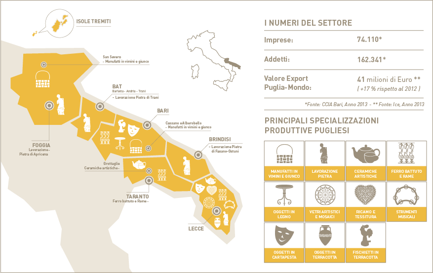 Il settore dell'Artigianato La Puglia, un concentrato di storia, culture e bellezze paesaggistiche, custodisce nel territorio tanti materiali che nelle mani dell’uomo si trasformano in oggetti di uso domestico e in vere e proprie opere d’arte. Una tradizione secolare che racchiude in sé tutta la storia della regione e che ancora oggi vive tra le strade e i vicoli dei centri storici. Importante risorsa economica, l’artigianato si è rafforzato nel tempo coniugando la tutela degli antichi mestieri con l’innovazione e l’internazionalizzazione. Ceramica, cartapesta, ricami, strumenti musicali, ferro battuto, vetri e mosaici sono solo alcune delle produzioni artigianali pugliesi; un universo vitale che rappresenta una risorsa culturale, turistica, occupazionale e creativa di grande rilievo. La ceramica è una delle produzioni tipiche della regione; concentrata nell’area di Grottaglie (Taranto), quest’arte artigiana si è sviluppata nel territorio con forme e lavorazioni differenti. La grande varietà di forme della ceramica pugliese può essere raccontata dai famosi fischietti di terracotta, uno dei simboli dell’artigianato pugliese. Anche i materiali più poveri diventano arte. Questo il caso della cartapesta, una delle espressioni più creative e rappresentative della regione. Dalla lavorazione della cartapesta prendono vita i tradizionali “pupi”, le statue a tema religioso usate nei presepi, e le maschere protagoniste del famoso Carnevale di Putignano. Presenti su tutto il territorio la tessitura e il ricamo sono un ulteriore tassello dell’artigianato regionale. Un racconto della storia delle donne pugliesi che ancora oggi realizzano oggetti preziosi e unici al mondo. Da sempre l’artigianato usa le materie prime del territorio, soprattutto quelle create dalla natura come il legno, il giunco o le canne palustri, che nelle mani degli artigiani pugliesi diventano oggetti della vita di tutti i giorni, strumenti musicali e manufatti artistici. In corrispondenza dei bacini estrattivi della pietra pugliese si è sviluppata nel tempo una fiorente lavorazione artigianale. Una combinazione di creatività e forza manuale che da vita a decori di palazzi e monumenti, oggetti di design e opere d’arte. Simbolo del barocco pugliese, il ferro battuto è un materiale che fa parte della tradizione artigianale del territorio. Balaustre di balconi e di scalinate, lampioni, candelieri, sono solo alcuni esempi di come il ferro battuto viene lavorato dagli artigiani pugliesi per abbellire i palazzi e le abitazioni. Anche la produzione di vetri artistici e mosaici fa parte dell’espressione artistica della regione. Nelle botteghe si creano ancora oggi oggetti di design e d’arredo che nascono dalla fusione del vetro con la creatività e i saperi artigianali che si tramandano da generazioni. Nella visione della Regione Puglia l’artigianato rappresenta un valore culturale ed economico importante per tutto il territorio. Per questo sono numerose le iniziative che supportano la crescita di un settore produttivo capace di rappresentare la cultura pugliese nel mondo.