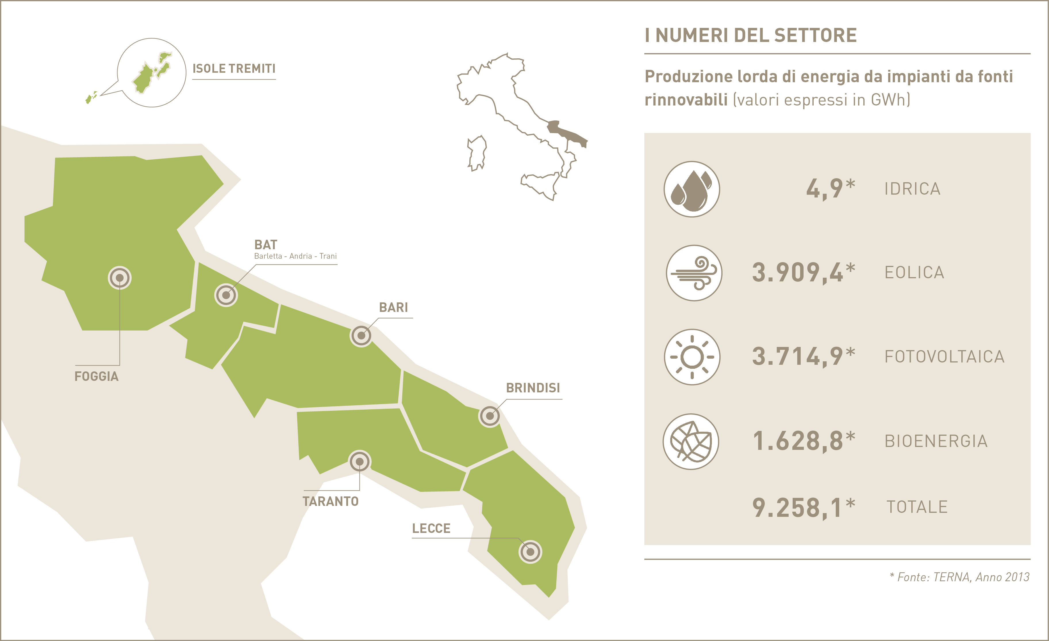 La green economy è un settore produttivo strategico che ha portato la Puglia a diventare una delle regioni più virtuose d’Italia. Grazie a politiche di sviluppo economiche attente ai temi ambientali e a una normativa tra le più innovative in Italia, la Puglia è infatti la regione leader nella produzione di energia pulita, confermandosi al primo posto per la produzione da fonti eoliche e fotovoltaiche e al terzo posto per le bioenergie. La Puglia inoltre è in prima fila per il recupero di siti inquinati, per la raccolta differenziata, per la tutela e il monitoraggio del territorio, delle coste e dei mari e infine per la bioedilizia. La tutela del paesaggio e dell’ambiente infatti passa anche per una progettazione urbana sostenibile. Le imprese edili pugliesi sono incentivate a costruire edifici sempre più efficienti sotto il profilo energetico e con un sempre minore impatto sul paesaggio, anche attraverso l’utilizzo usando materiali naturali e di provenienza locale.