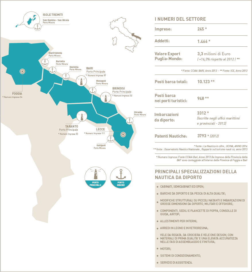 ll Settore della Nautica da Diporto La Puglia è caratterizzata da una posizione geografica strategica, ponte tra Oriente e Occidente e porta dei Balcani, e da una costa che si snoda per ben 865 km, dotata di 3 porti principali (Bari, Brindisi e Taranto) e 6 minori. Queste caratteristiche, unite alla bellezza del mare, al clima mite tutto l’anno, ad una fitta presenza di porti, marine, darsene e approdi, ad un tessuto industriale moderno e dinamico, hanno fatto della Puglia il territorio ideale per lo sviluppo della nautica da diporto. Dalla tradizione all’innovazione, questa è la chiave di lettura del settore della nautica da diporto in Puglia. Oggi, la nautica pugliese è promotrice di ricerca e innovazione. Le produzioni tradizionali si sono evolute verso procedimenti tecnologicamente avanzati con ricorso a materiali innovativi, a componenti ecosostenibili, che consentono di realizzare imbarcazioni più leggere e resistenti e con minore dispendio di carburante. |