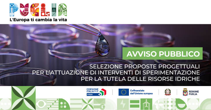 Si informa che con Determinazione n. 273 del 25/11/2025 del Dirigente della Sezione risorse Idriche, è stato approvato l'Avviso pubblico per la selezione di proposte progettuali finalizzate all’attuazione di “Interventi per l’introduzione di misure innovative in materia di risparmio idrico, depurazione, riabilitazione dei corpi idrici degradati, rafforzamento dei sistemi informativi di monitoraggio dei corpi idrici e della qualità della risorsa idrica” adottato a valere sul PR Puglia 2021-2027 - Priorità 2, Azione 2.9 - Sub azione 2.9.1: Interventi per il mantenimento e il miglioramento della qualità dei corpi idrici”.