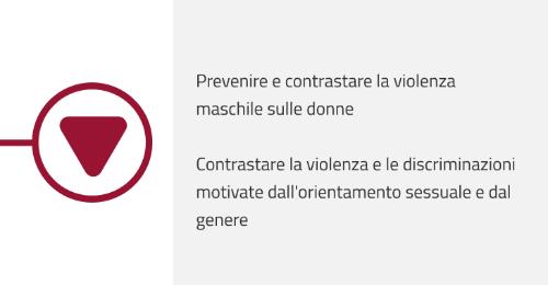 L’obiettivo strategico è contrastare la violenza maschile sulle donne e la violenza motivata dall'orientamento sessuale e dall'identità di genere e ogni forma di marginalità e discriminazione intervenendo sulle povertà, rafforzando le misure di sostegno al reddito, di inclusione sociale delle persone immigrate, potenziando la rete dei centri antiviolenza, la formazione nelle scuole, offrendo sostegno economico alle vittime di violenza.