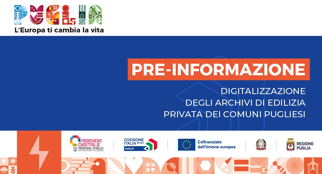 Con Deliberazione n.923 del 28 giugno 2024, pubblicata sul BURP n.58 del 18/07/2024, la Giunta Regionale ha approvato la scheda di pre-informazione relativa all’Avviso di selezione per il finanziamento di proposte progettuali finalizzate alla digitalizzazione degli archivi di edilizia privata dei Comuni pugliesi nell'ambito dell' Asse Prioritario I - “Competitività e Innovazione” – Azione 1.8 “Interventi di digitalizzazione della P.A. e diffusione di infrastrutture e servizi digitali a favore di cittadini ed imprese”.